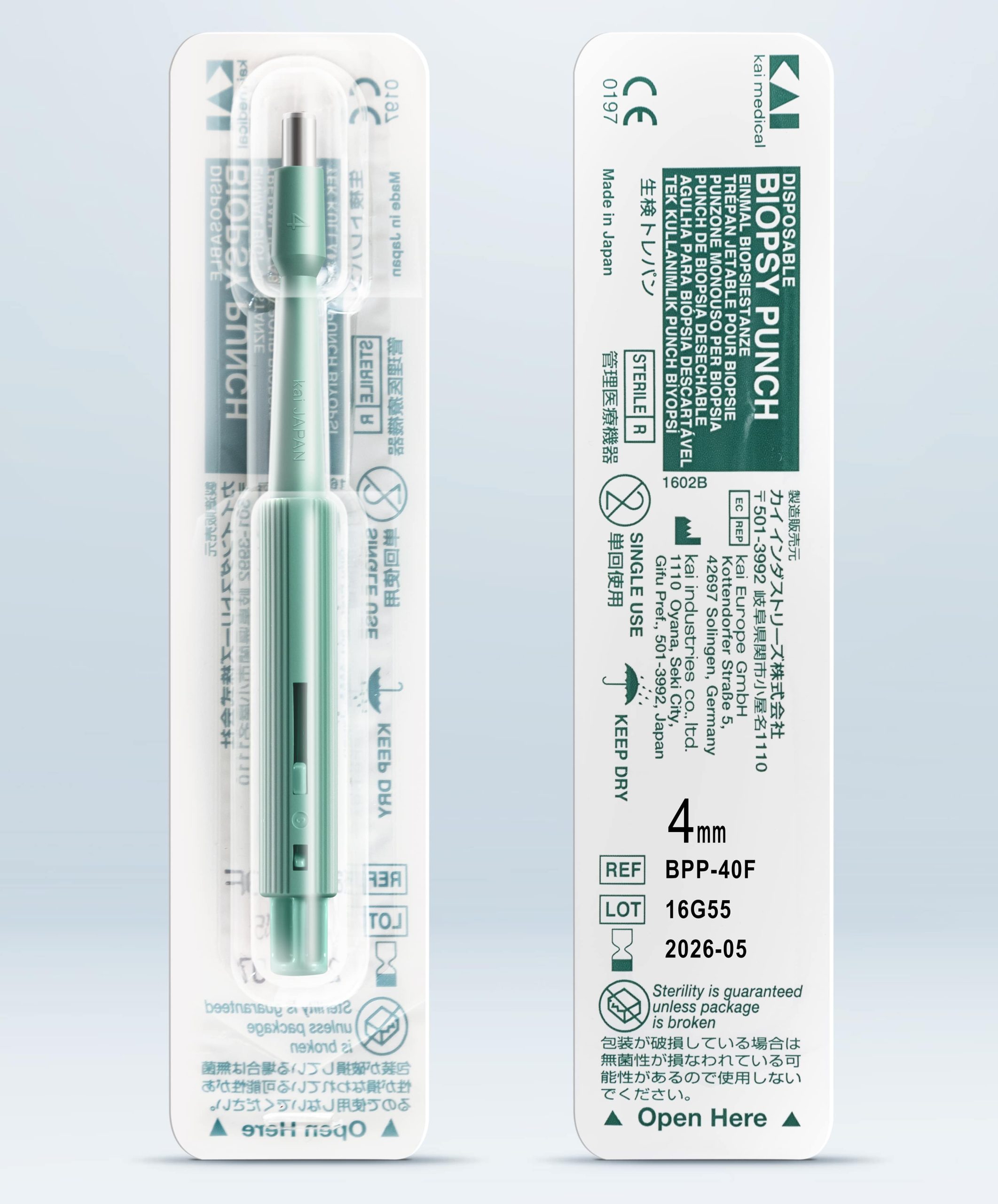 Los punchs Kai Medical® son completamente lisos y continuos (“seamless“). Esta característica, sumada a un afilado de grado quirúrgico, permite que el instrumento se deslice a través de la epidermis y la dermis (o mucosa y submucosa) con una resistencia mínima. El resultado es un corte cilíndrico perfecto, sin compresión lateral, que facilita una cicatrización más rápida y estética para el paciente. - Profundidad y Representatividad: Gracias a su diseño avanzado, este punch asegura un corte transversal representativo que alcanza la profundidad necesaria, incluyendo una escisión de tejido suficientemente amplia de la dermis profunda o tejido conectivo, asegurando que el área patológica esté incluida en la muestra.